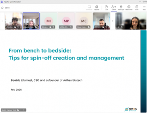 During the session, Beatriz Llamusí Troisí, co-founder of the spin-off, shared her personal journey of creating and managing a successful biotech spin‑off. Through concrete examples from Arthex, she offered practical, honest advice for scientists considering entrepreneurship.