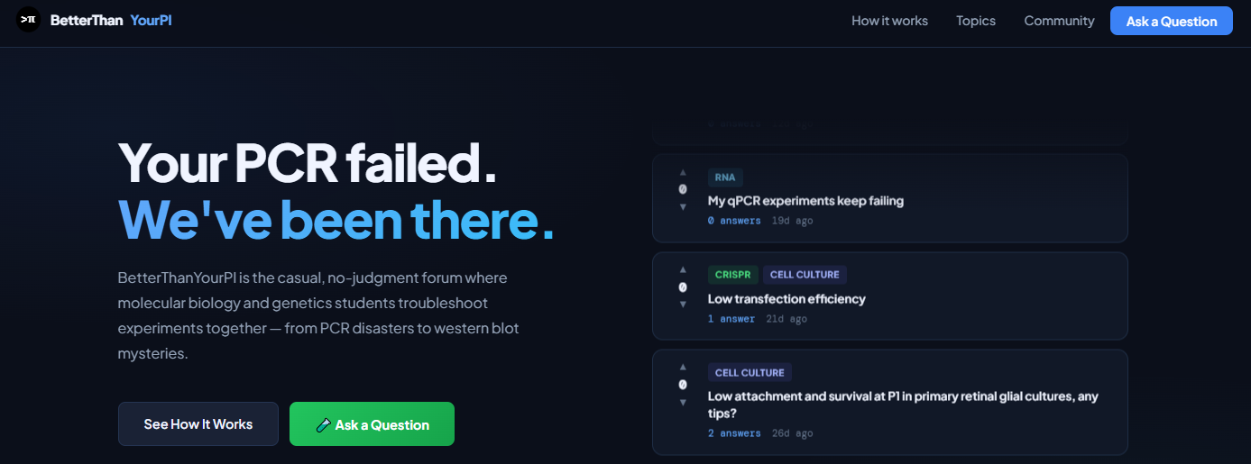 DC8 Ceren Şahin from Universidad de Alicante, doctoral candidate within the RETORNA network, has built BetterThanYourPI (betterthanyourpi.com), a free, no-judgment online forum where life science students troubleshoot lab experiments together. Covering topics from PCR and cloning to CRISPR and flow cytometry, the platform fills a real gap in researcher support by connecting students across institutions in real time. It is free for everyone and open to the wider scientific community.